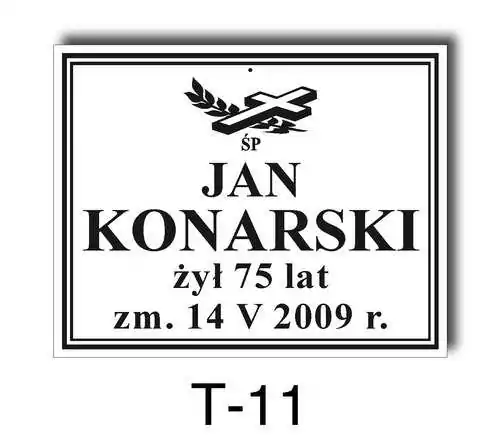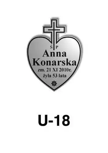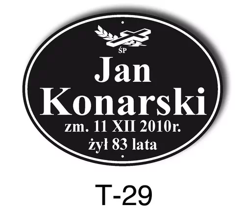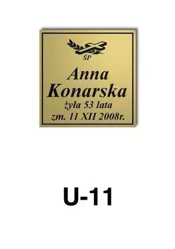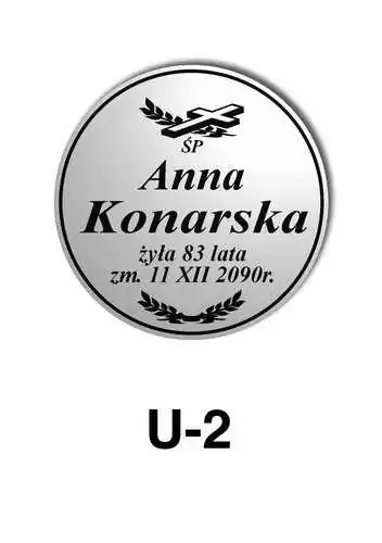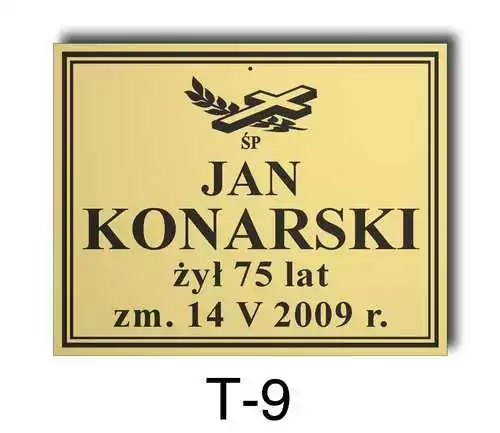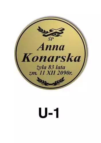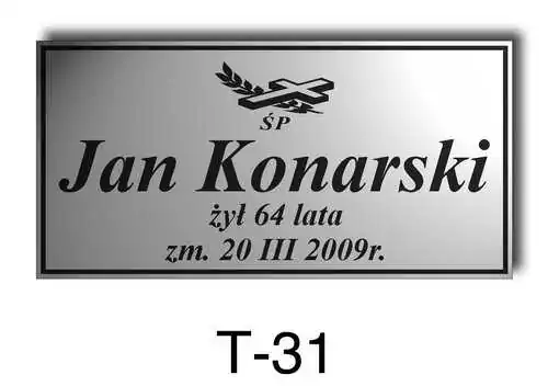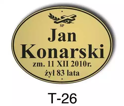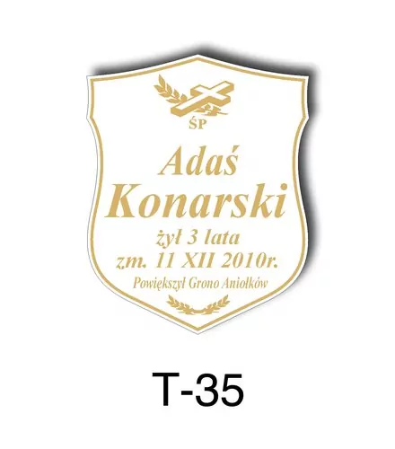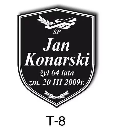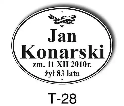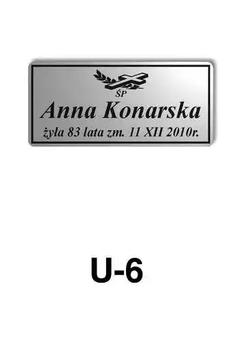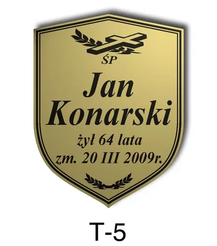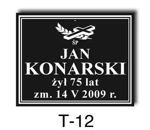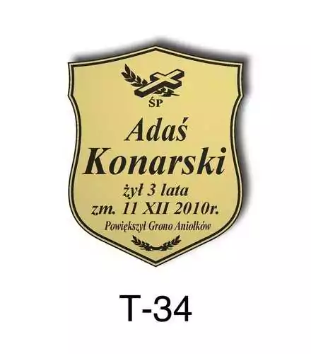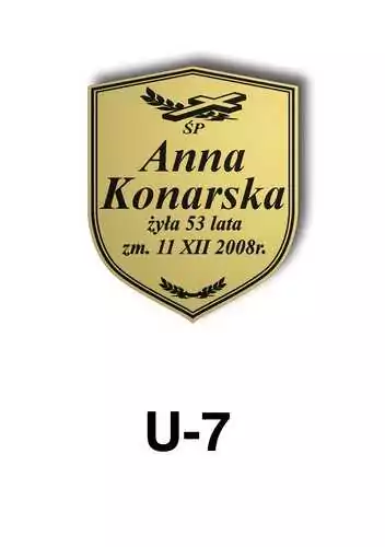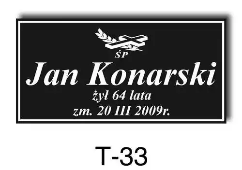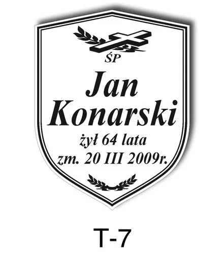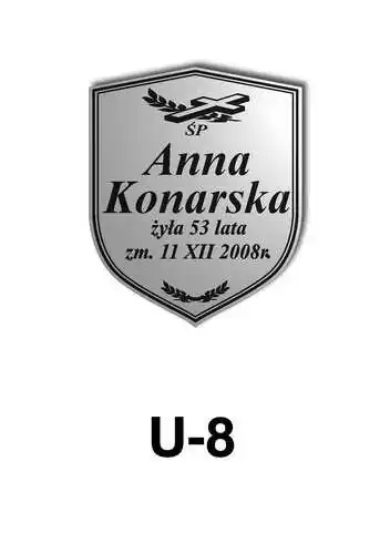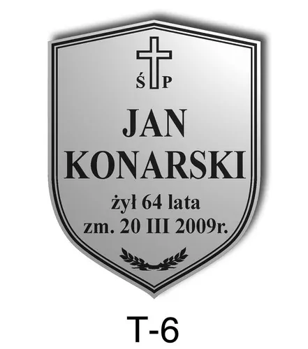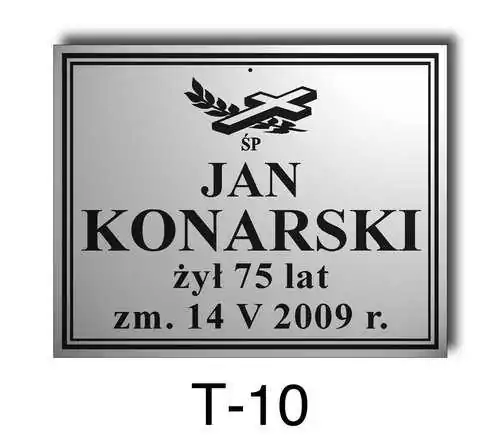 Tabliczka zawiera podstawowe informację o osobie zmarłej tj. imię i nazwisko, datę śmierci oraz liczbę przeżytych lat. W zależności od obrzędu pogrzebowego zawiera charakterystyczne symbole zgodne z wyznaniem zmarłego. Tabliczka umieszczana jest na trumnie bądź urnie, na nagrobku lub krzyżu znajdującym na grobie. Wszystkie tabliczki wykonywane są z metali nierdzewnych. Zobacz tabliczki oferowane przez nasz zakład pogrzebowy Warszawa.